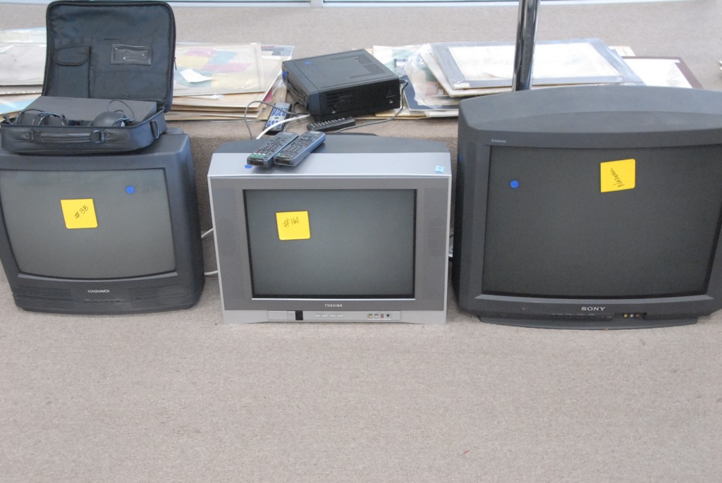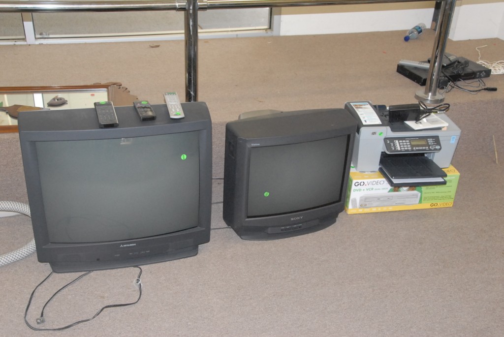 Group lot two portable televisions and HP office jet 5610 all in one printer fax scanner copier along with brand new Go Video DVD/VCR in box.