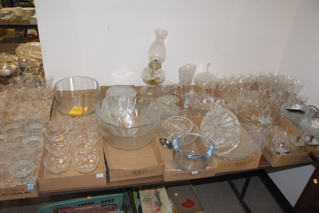 Fifteen boxes of crystal, clear glass, pressed glass, bowls, stems, plates, and miscellaneous.