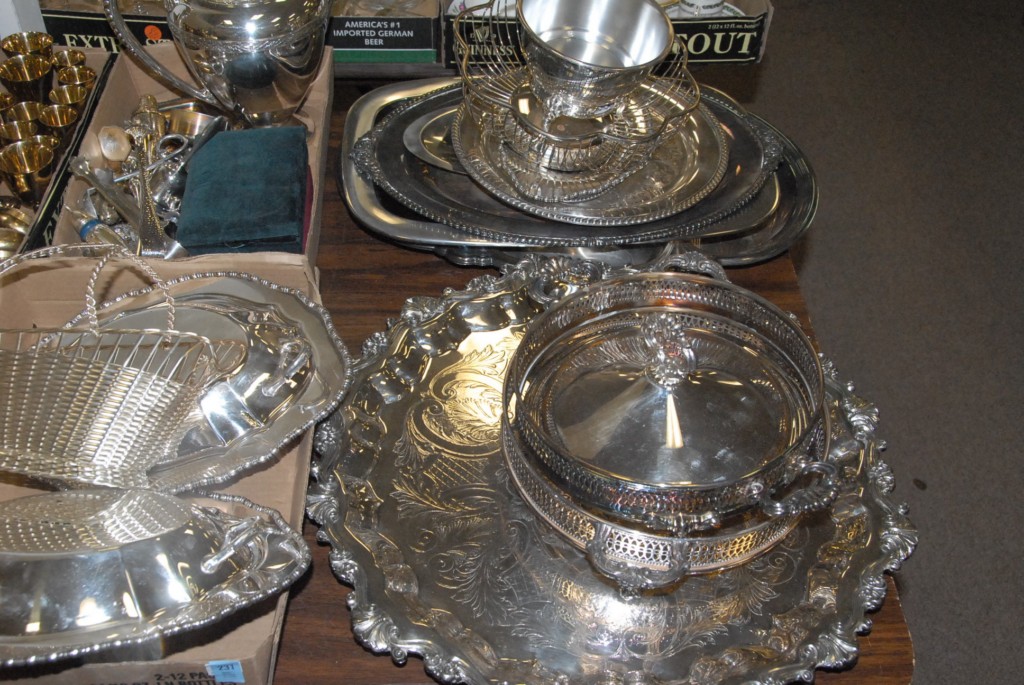 Group lot of silver plate large round tray, several tray covered dishes, pitcher, misc.