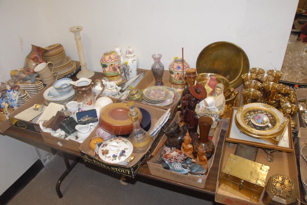 Eleven box lots brass, Chinese porcelain, Aynsley, cobalt plates, depression glass, alabaster candlesticks and misc.