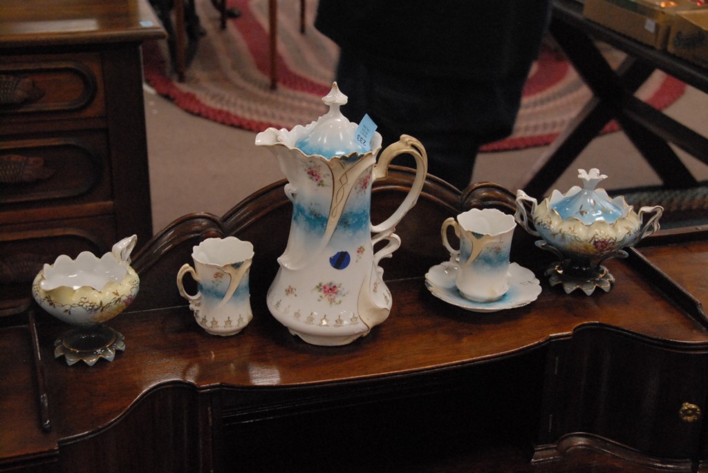Six piece lot of chocolate pot, two cups, sugar and creamer not matching, and one saucer has crack.