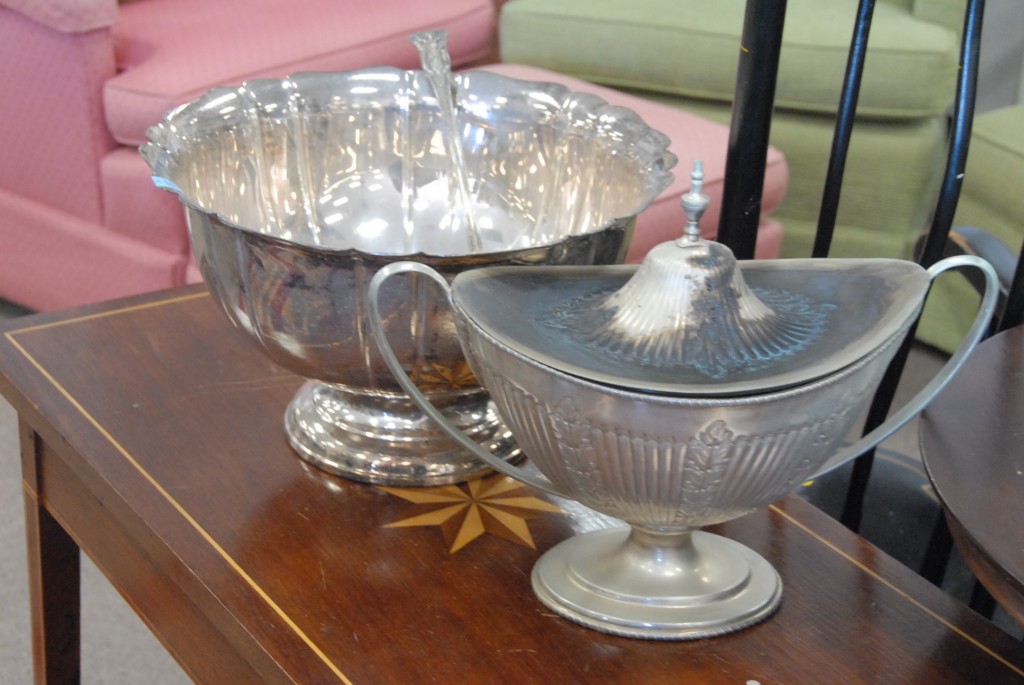 Silverplate lot large punch bowl, ladle, and Federal style covered urn.