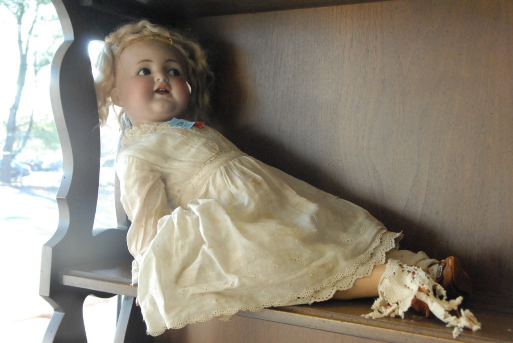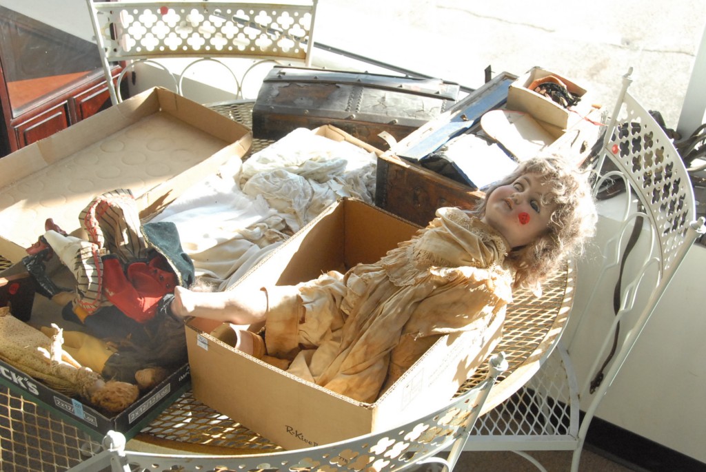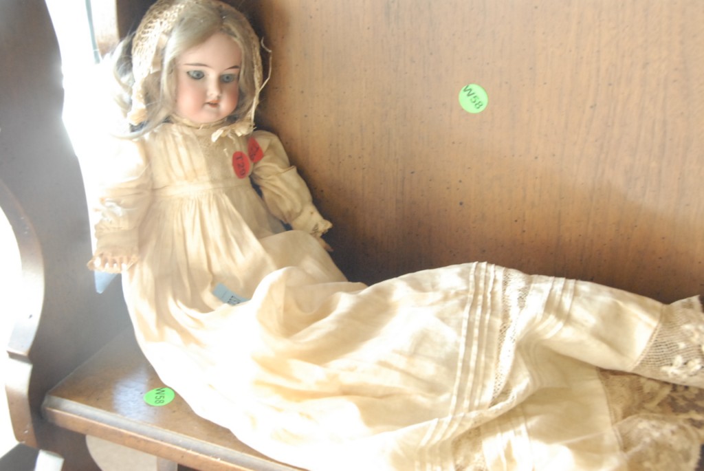 Group lot five dolls – two are bisque head, doll’s trunk with clothes, and box of doll’s clothes.