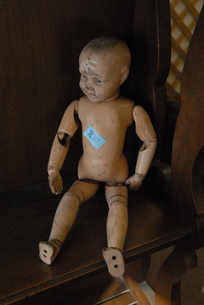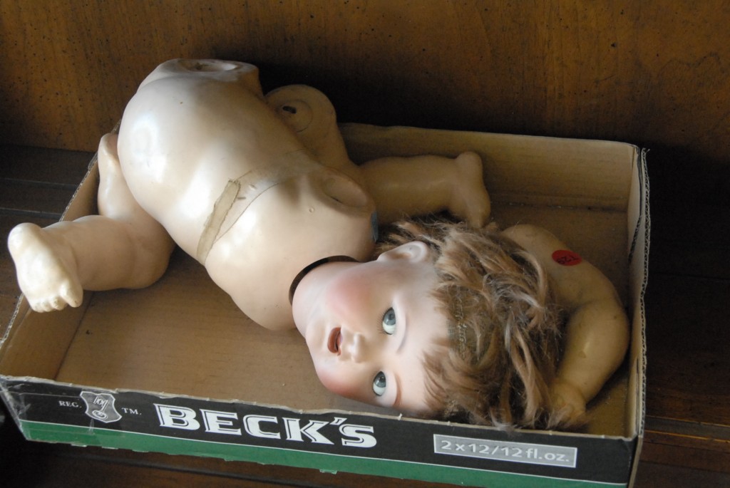 Simon Halbig German bisque head doll with squeak toy inside, crying baby, in parts, composition arms and legs.