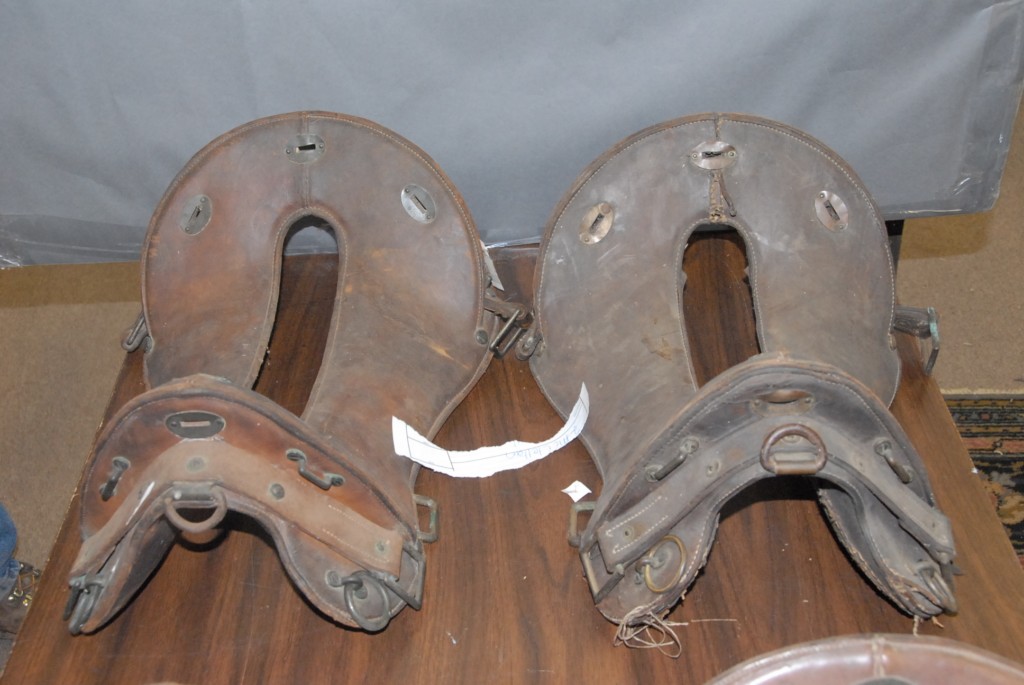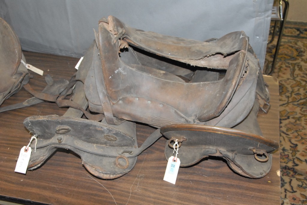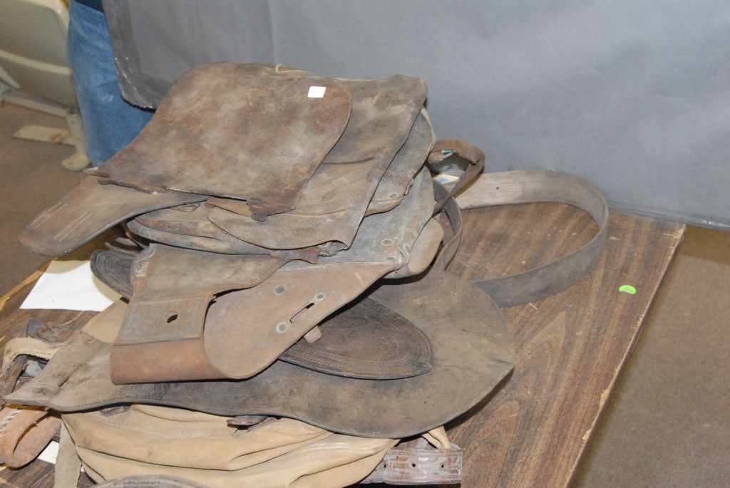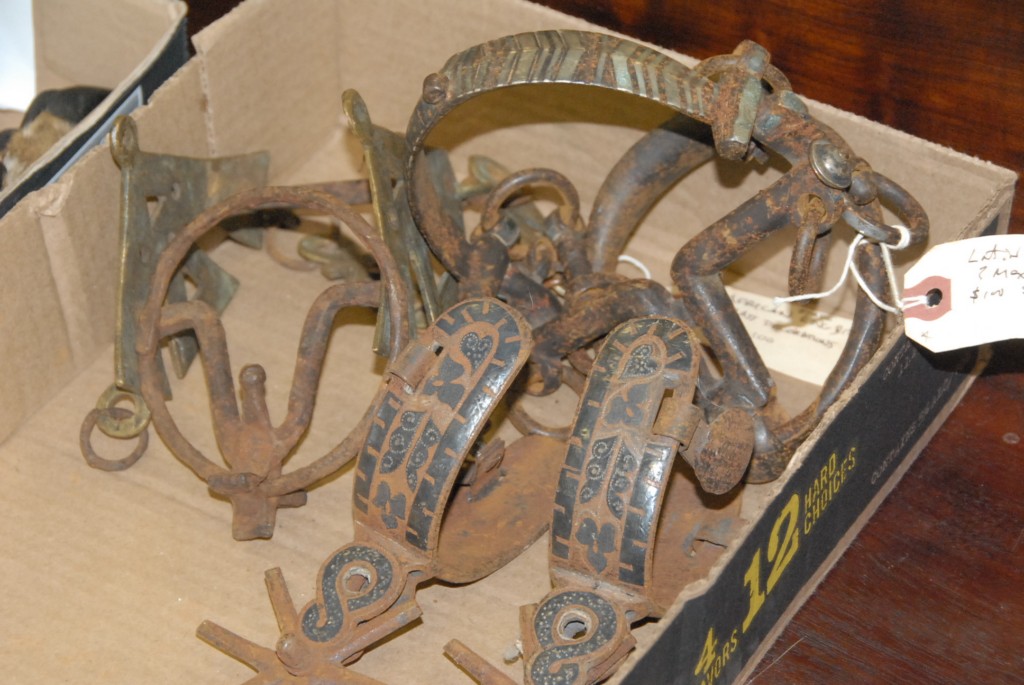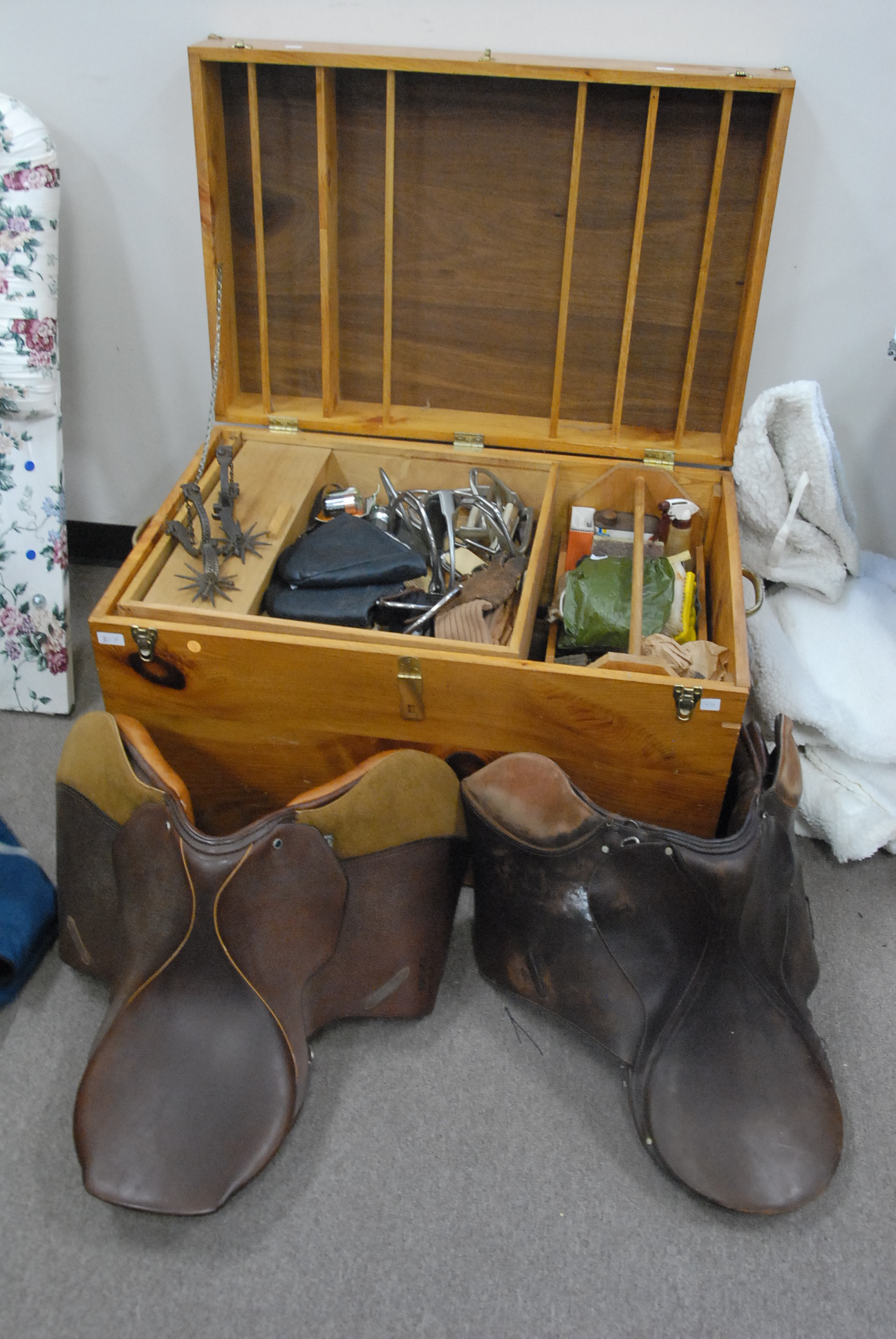 Large satchel with horse related items to include riding boots and chaps, pair of English boots, two riding crops with antler handles and wipe, two 19th century spurs