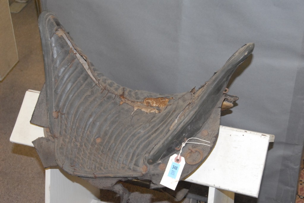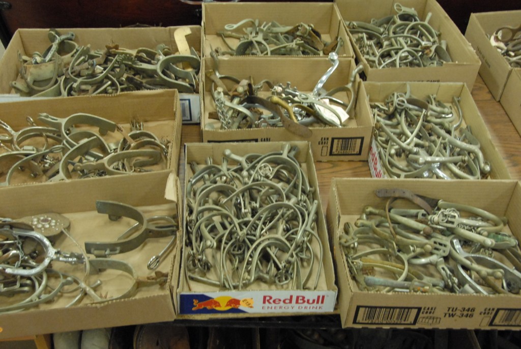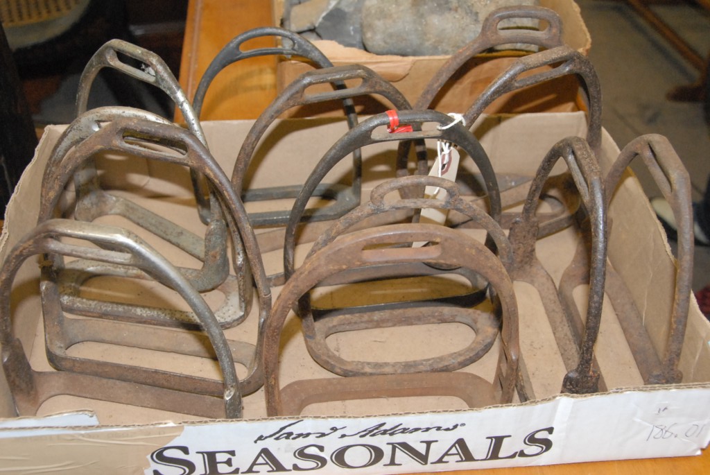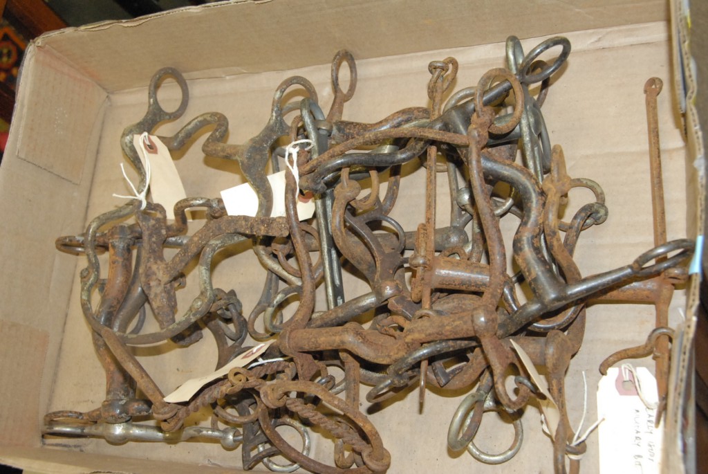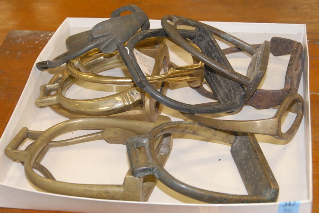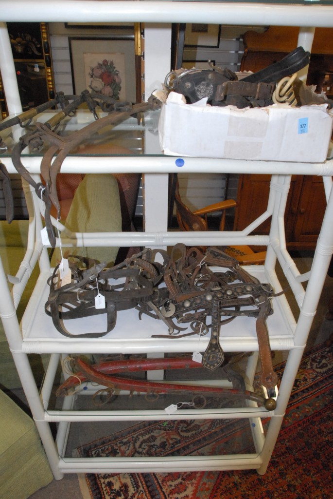 Large satchel with horse related items to include riding boots and chaps, pair of English boots, two riding crops with antler handles and wipe, two 19th century spurs