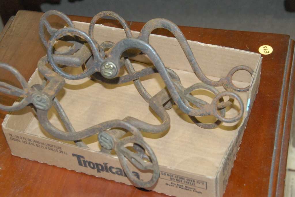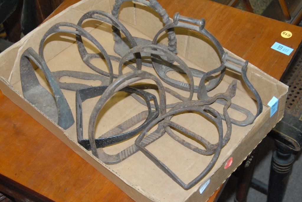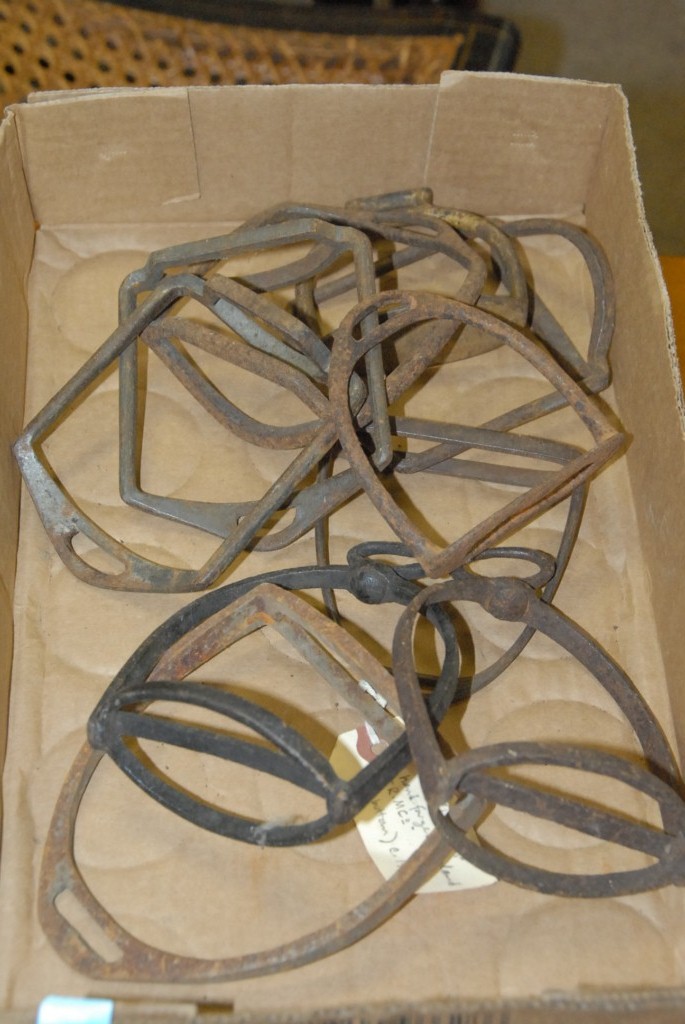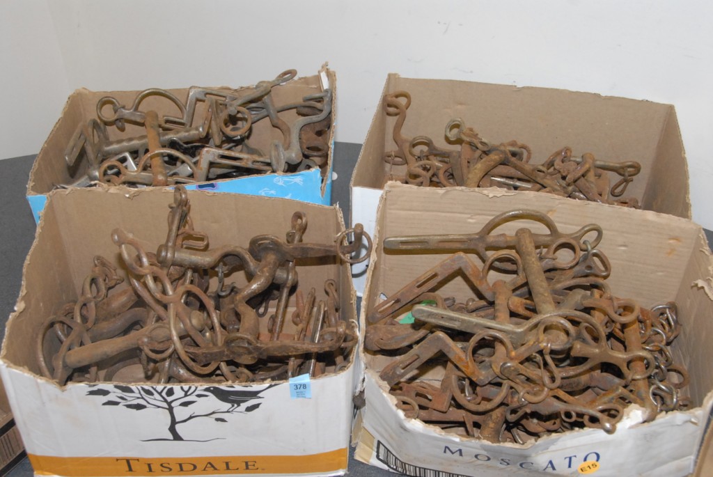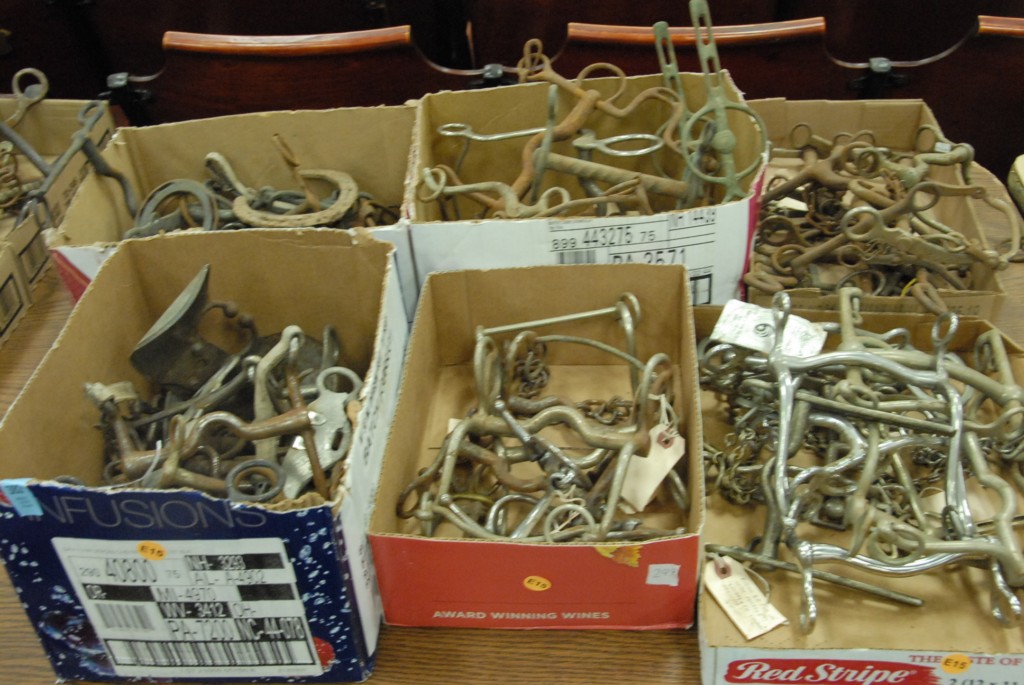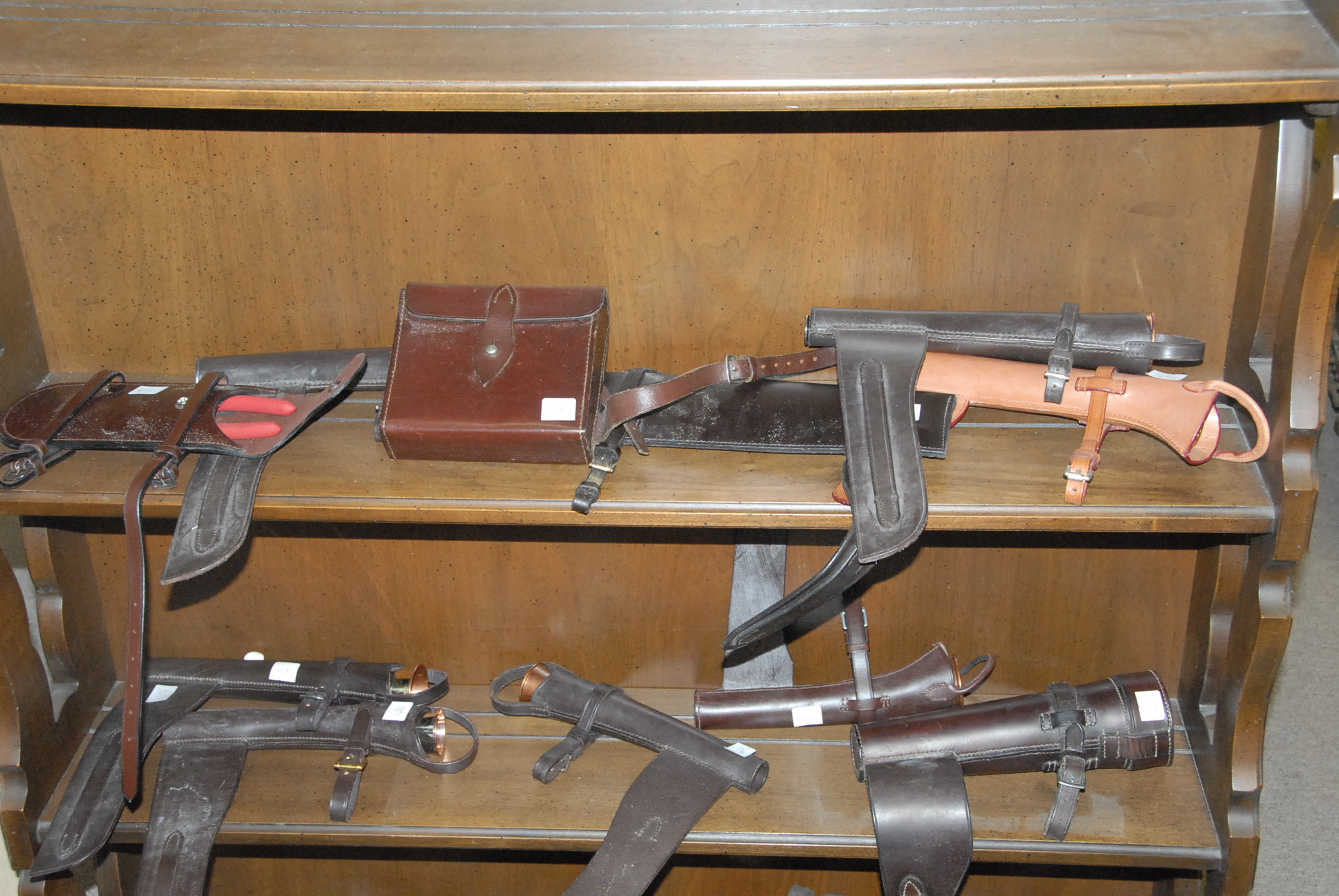 Large satchel with horse related items to include riding boots and chaps, pair of English boots, two riding crops with antler handles and wipe, two 19th century spurs