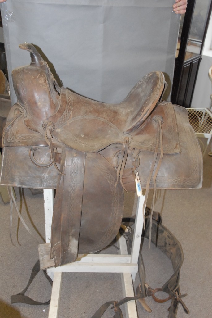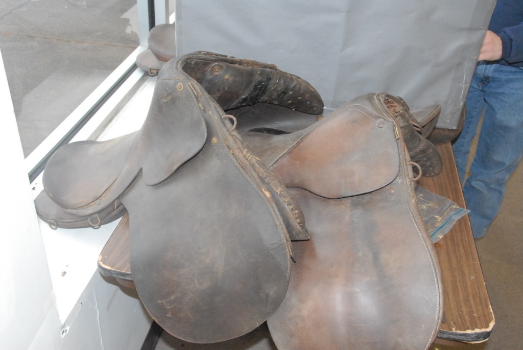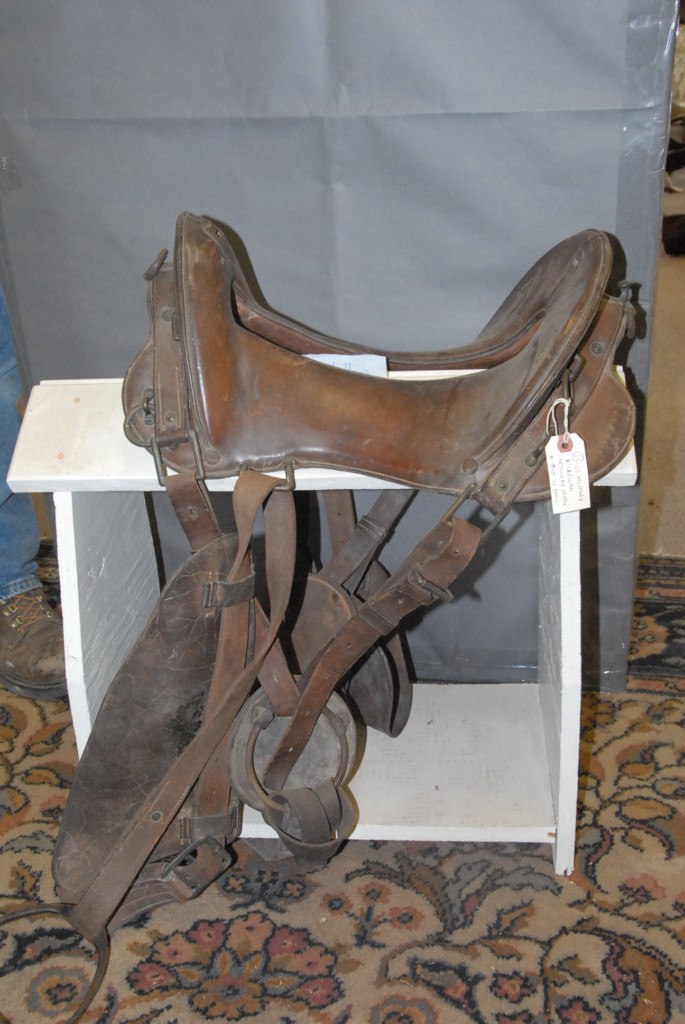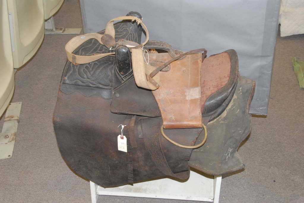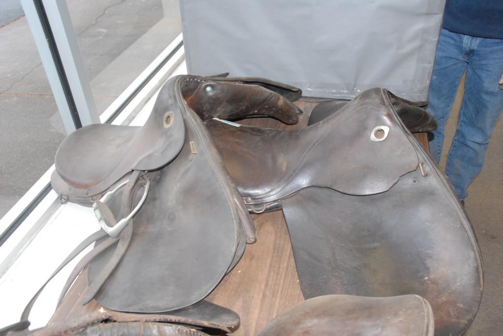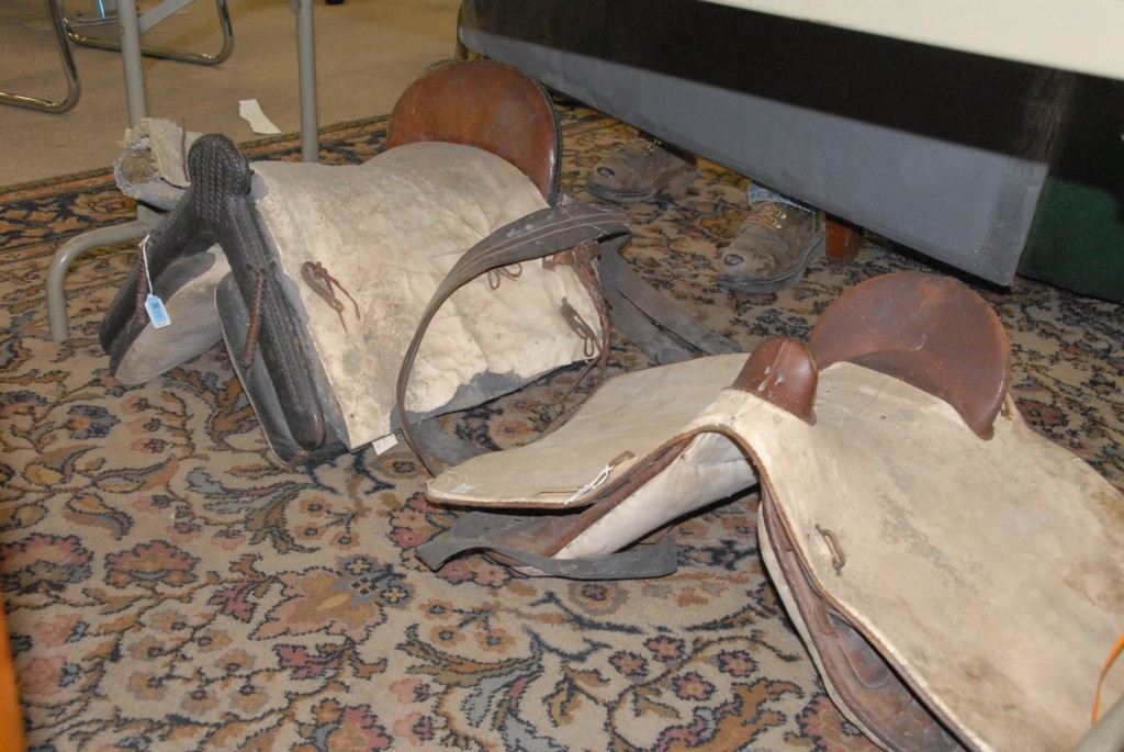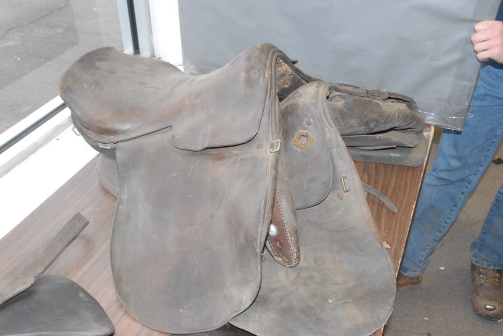 Horse riding gear to include two English riding saddles one marked Stubben along with a custom wooden lift top box with bridles and cleaning accessories and horse blankets