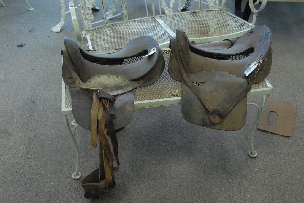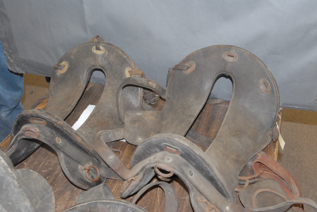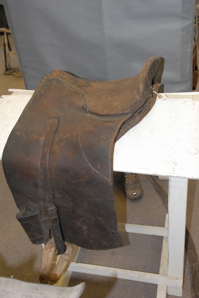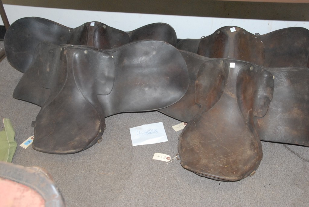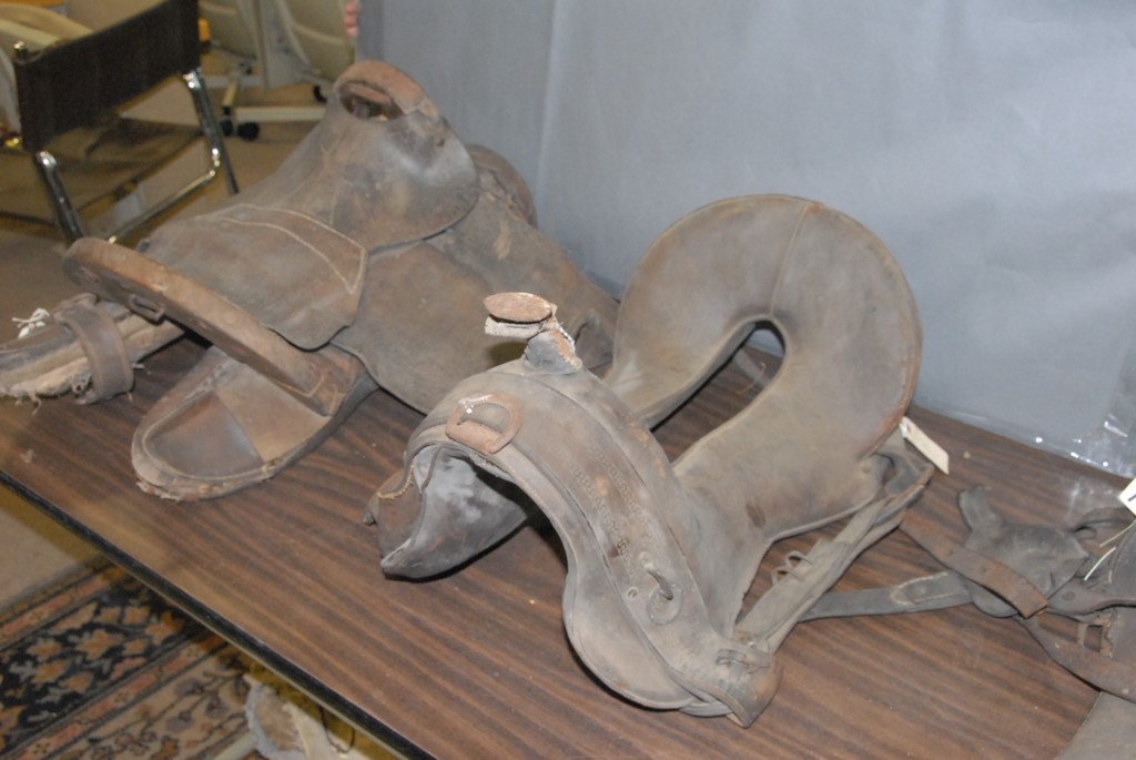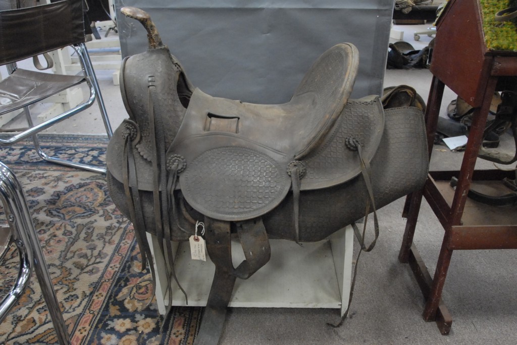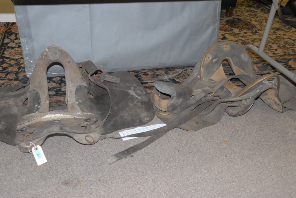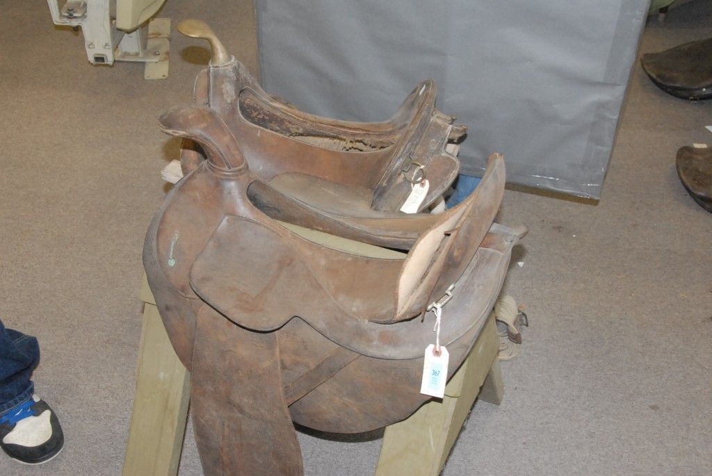 Horse riding gear to include two English riding saddles one marked Stubben along with a custom wooden lift top box with bridles and cleaning accessories and horse blankets