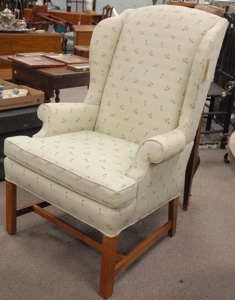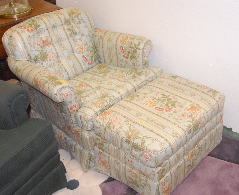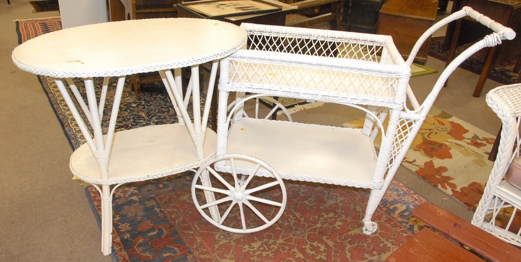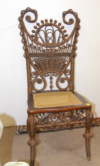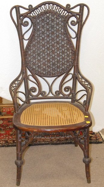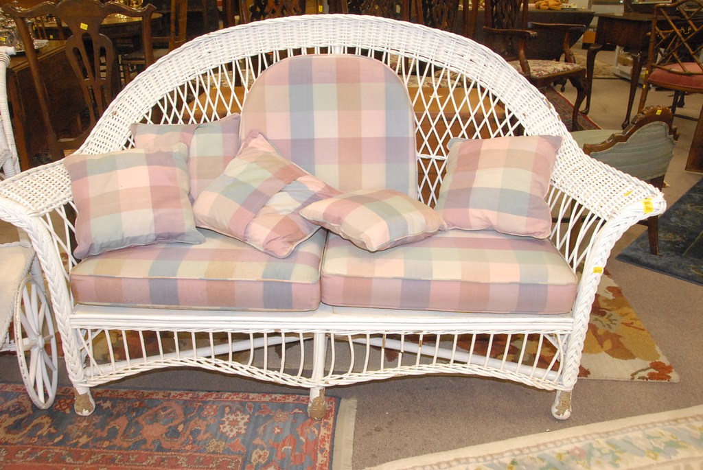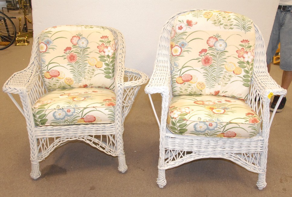 Two wicker armchairs with cushion, one with built in magazine rack.