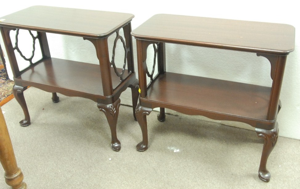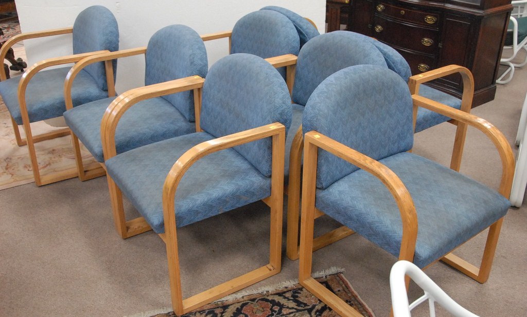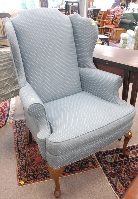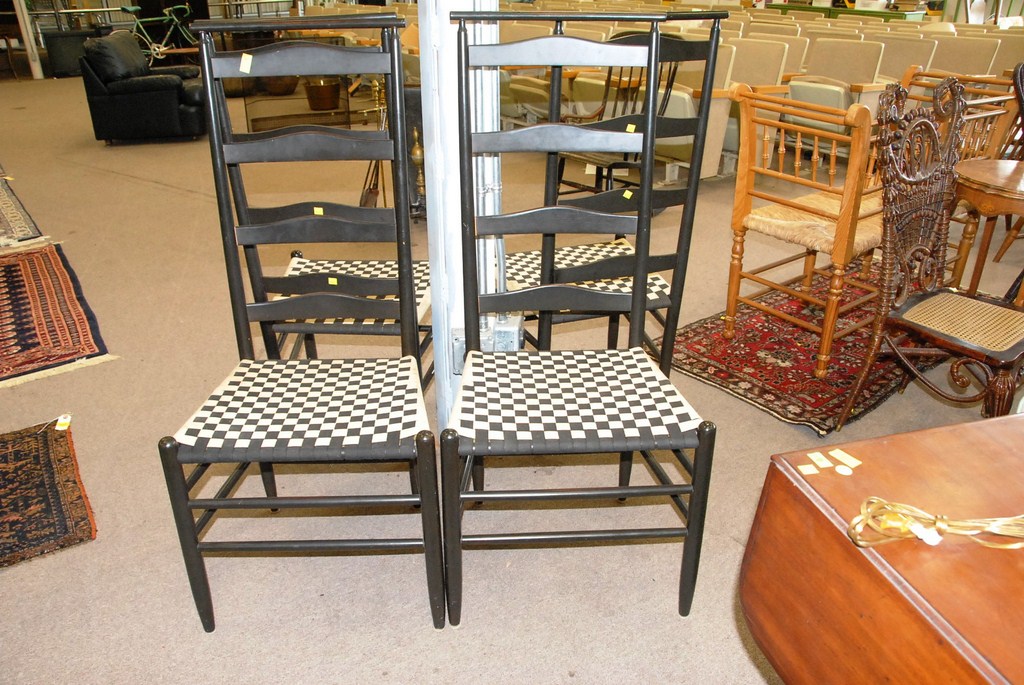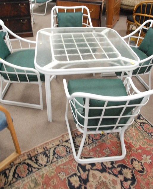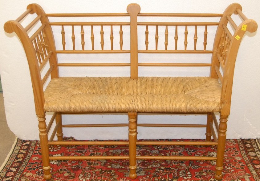 Two wicker armchairs with cushion, one with built in magazine rack.