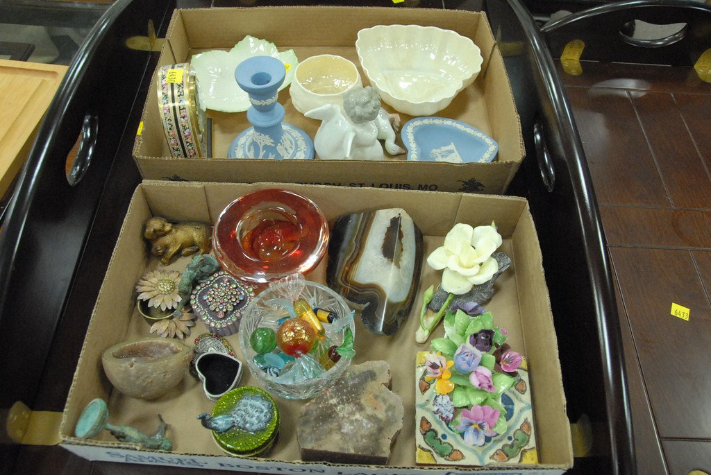 Two box lots Irish Belleek, Lladro, Boehm bird, and various curios