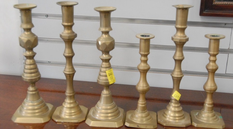 Three pairs of brass candlesticks including a pair of push-up candle sticks.