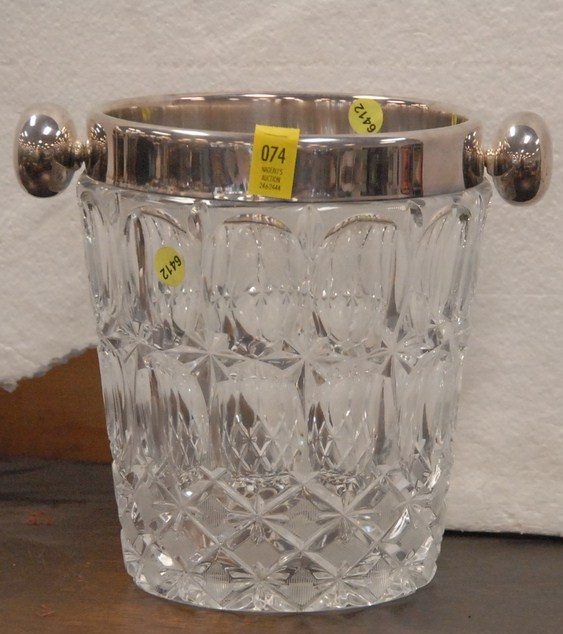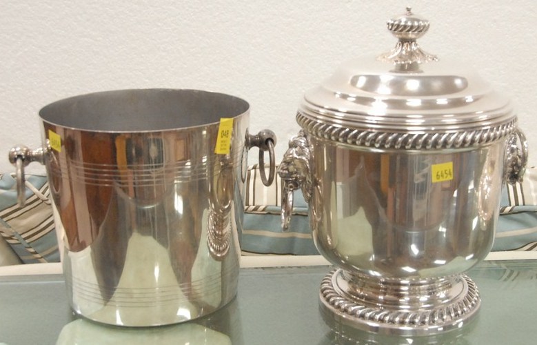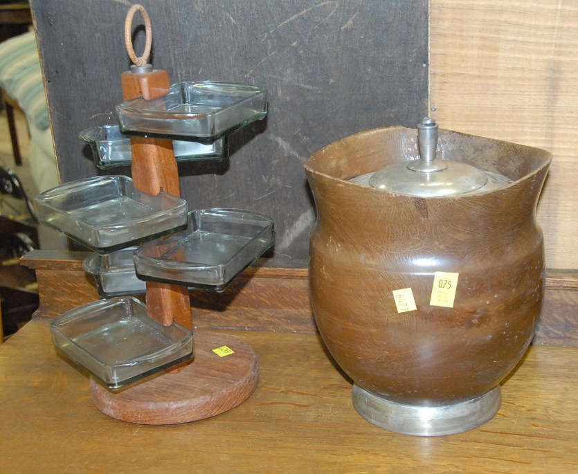 Unusual wood ice bucket with sterling silver top and foot, Frank Whiting and Company along with teak serving revolving stand with glass dishes.