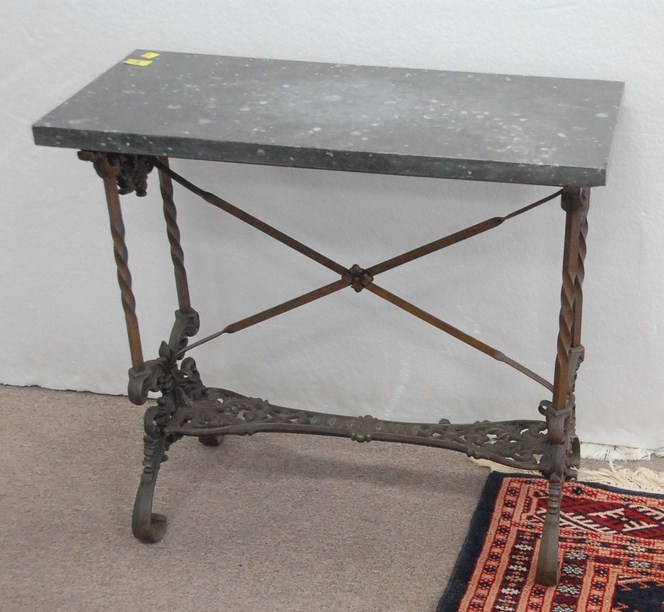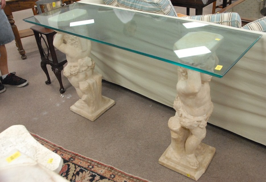 Glass top sofa / hall table held up by two cherubs one chip in base of cherub.