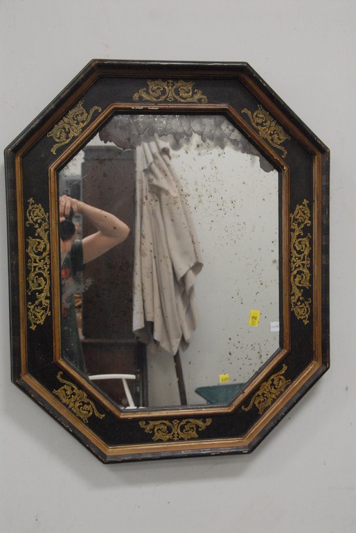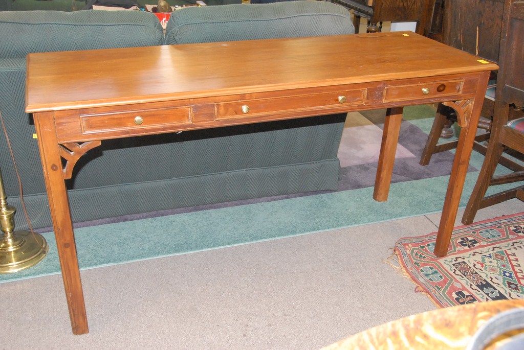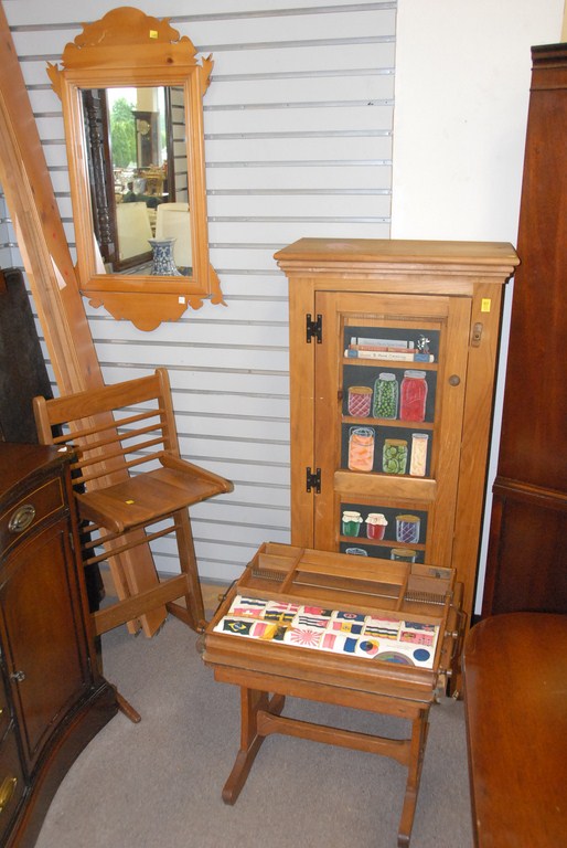 Four piece lot teak stand, small pine cabinet with one door, children’s map, and pine mirror.