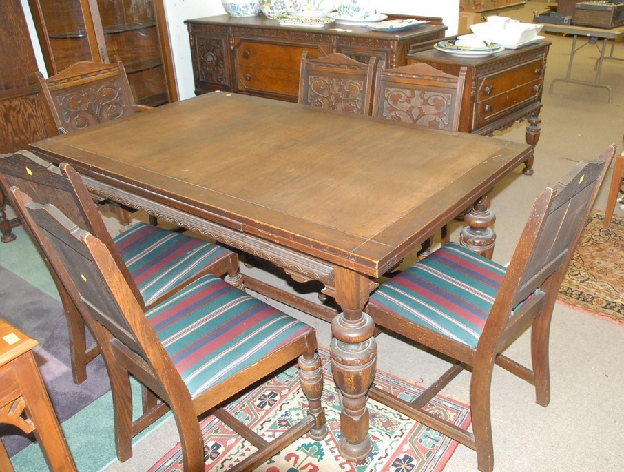 Oak Jacobean ten piece dining set hutch, sideboard, server, six chairs and table with extensions.