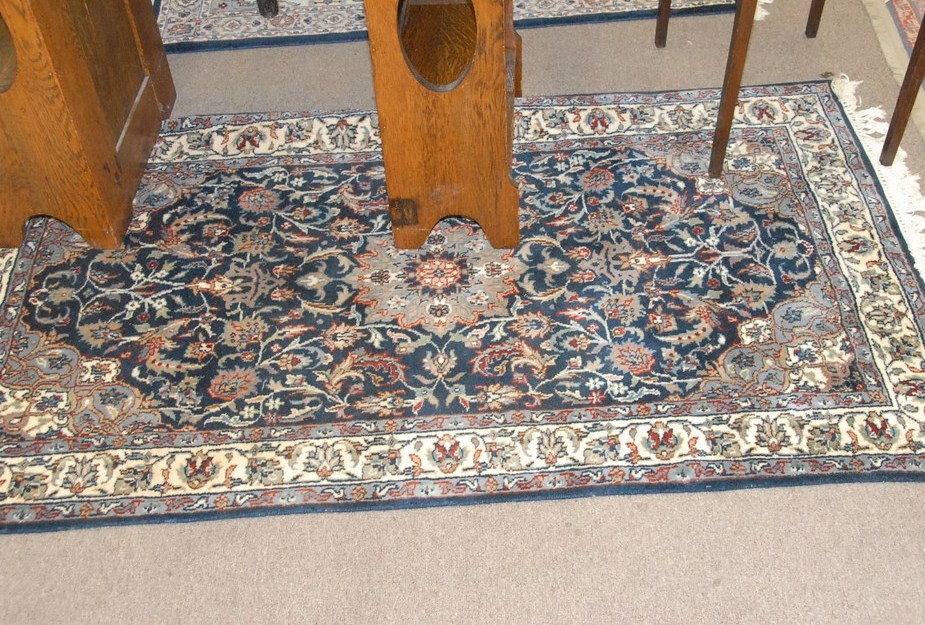 Two blue hand made wool Oriental rugs, 3′ x 5’6 and 2’6 x 4’4.