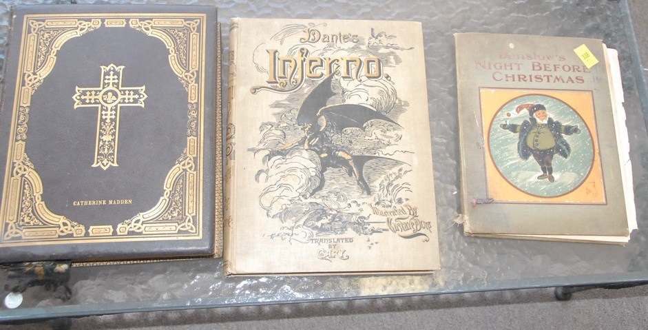 Three books Dante’s Inferno illustrated by Gustof Dore translated by Kelly, Denslow’s Night Before Christmas, and Catherine Madden’s Bible.
