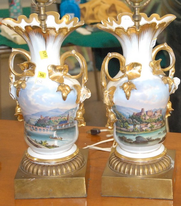 Pair of Paris Porcelain table lamps with hand painted European scenes, some repairs.