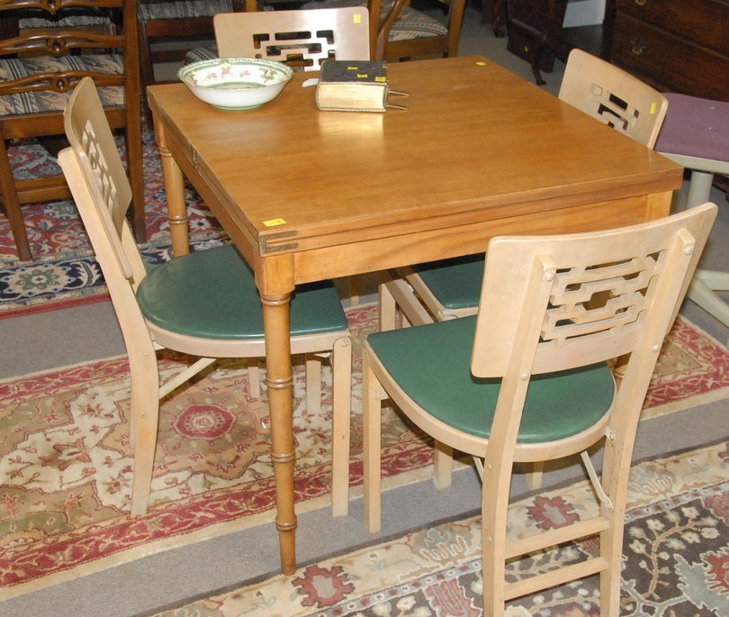 Flip top card table with bamboo legs and four folding chairs.