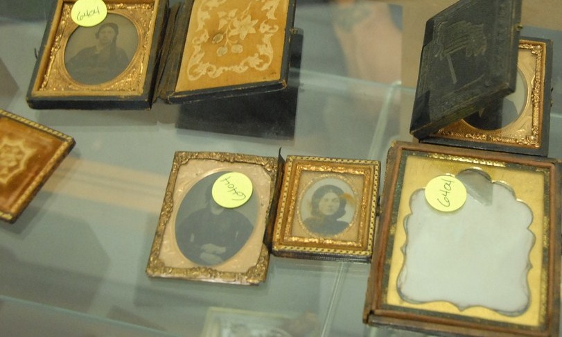 Group of daguerreotype and tintypes along with glass shade.