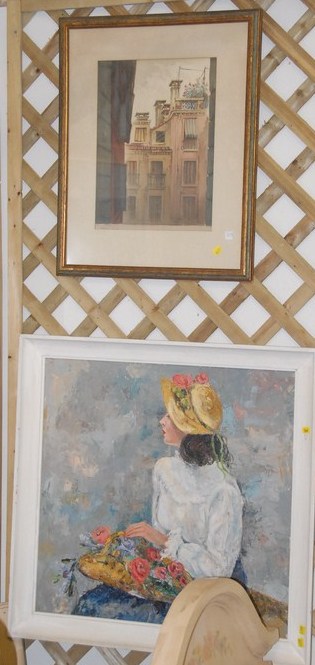 Two framed pieces oil on canvas of girl with flowers signed lower right S. Rothany 53 and watercolor of side of building signed lower left O. W. Larkin.