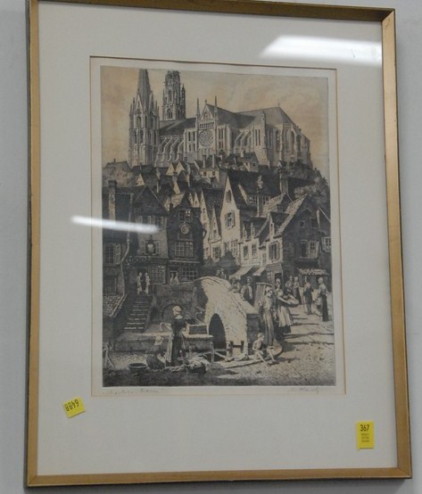 Two piece lot pencil signed etching Shantras, France signed lower right S. Karoly and oval gold framed mirror.