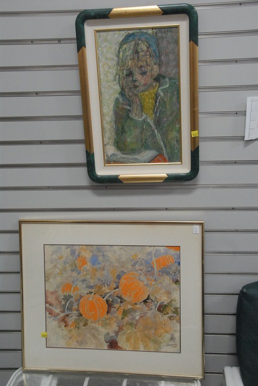 Two framed pieces oil on canvas of girl signed indistinctly lower right and watercolor of pumpkin signed lower right.