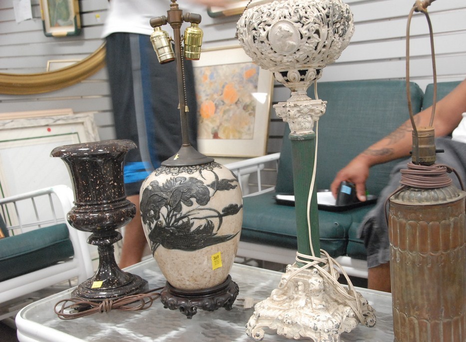Group of three lamps and marble urn, one lamp is porcelain Oriental.