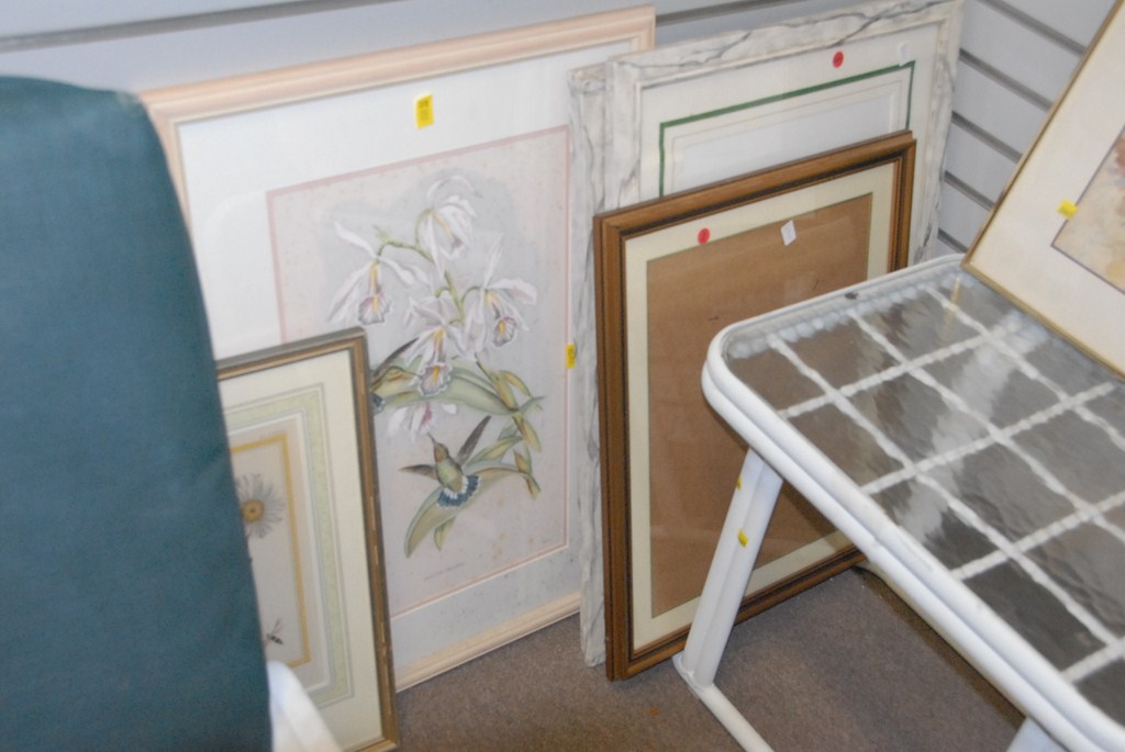 Group of seven frames and two botanical prints.