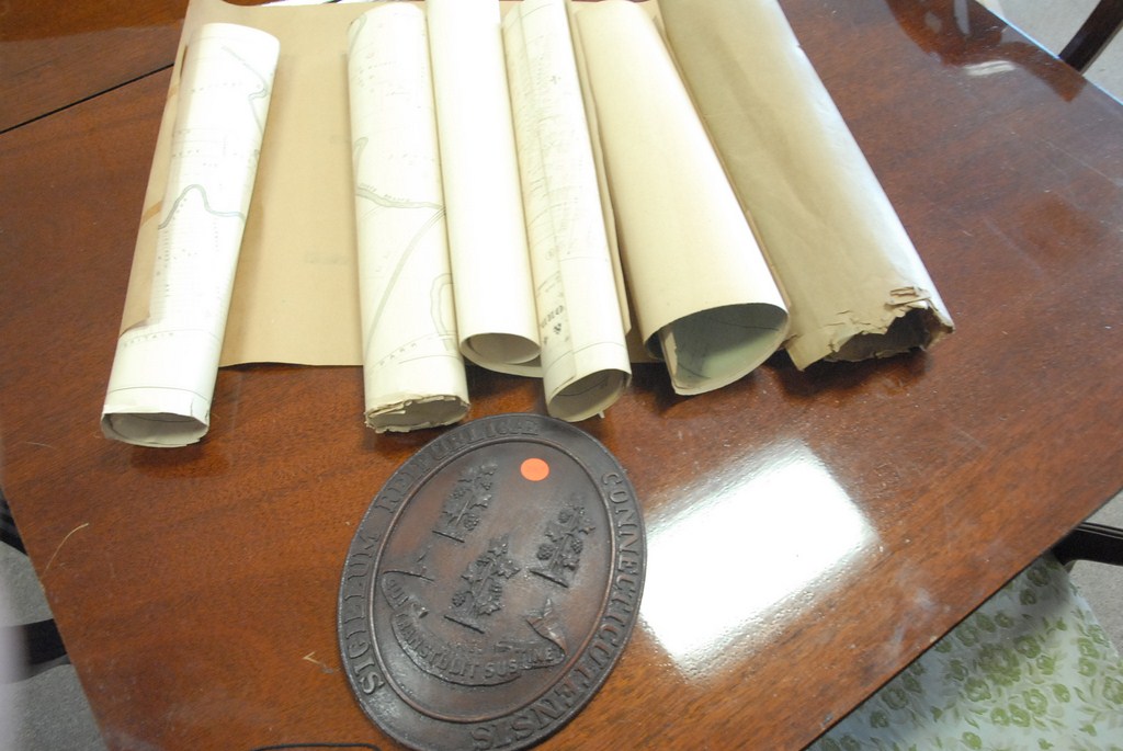 Group of early maps and wood plaque of Connecticut Census.