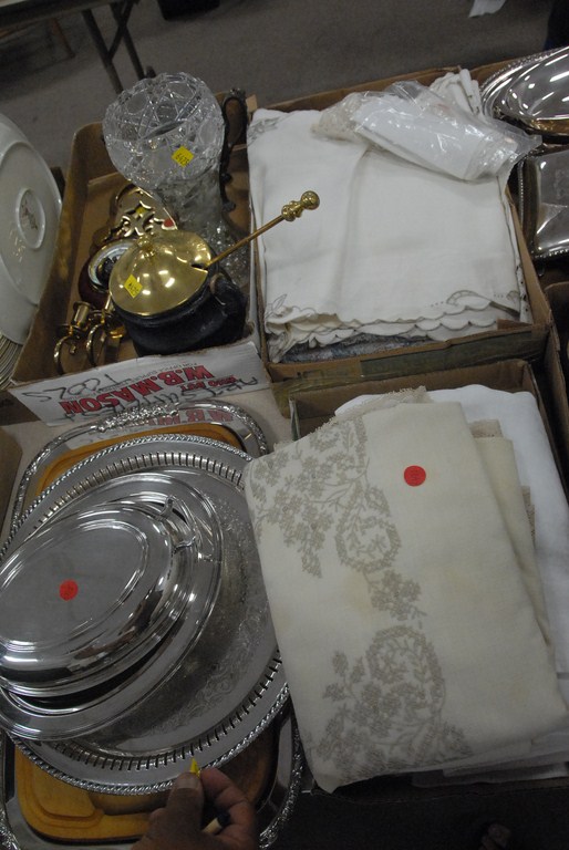 Group of three box lots brass, silverplate, cut glass, and linens.