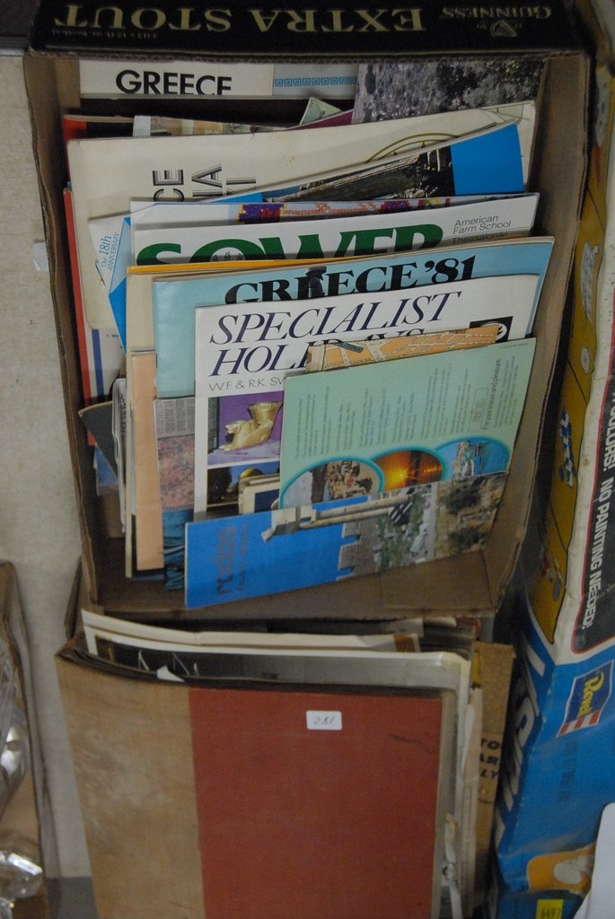 Two boxes with ephemera, scrapbooks, maps, etc.