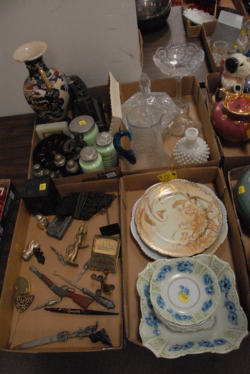Four box lots china, glass, bronzes, etc.
