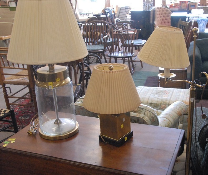Three lamps two table lamps and floor lamp.