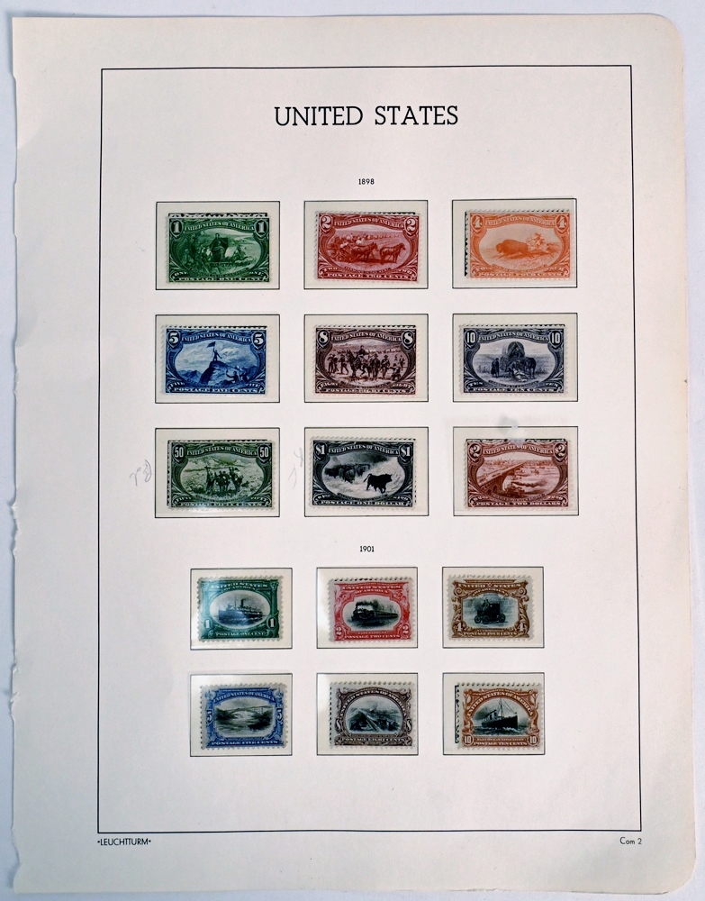 U.S Complete Mint Set of Stamps, Trans-Mississippi and Pan- American stamps to include, “Marquette on the Mississippi”, “Western Cattle in Storm”, “Mississippi River Bridge”, “Western Mining Prospector”, “Farming the West”, “Indian Hunting Buffalo”, “Fremont on Rocky Mountains”, “Troops Charging Train”, “Hardships of Emigration”, “Eastlake Navigation”, “East Express”, “Automobile”, “East Ocean Navigation”, “Canal locks at Sault De Ste Marie”, “Bridge at Niagra Falls”.