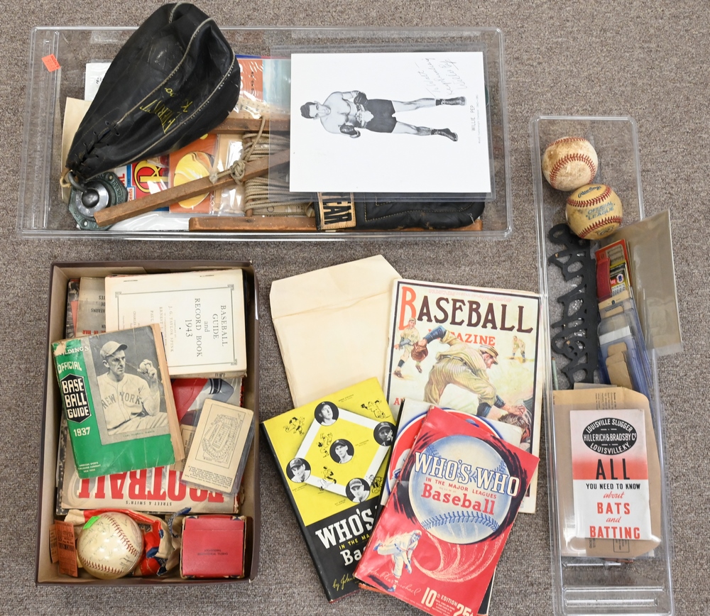 Assorted Group of Football and Baseball Memorabilia, to include Harvard, Notre Dame, Dartmouth, Boston University tickets, Fenway Park tickets, baseball printed photos, baseball magazine, Street and Smith’s football magazines, boxing gloves, old ticket stubs, etc.