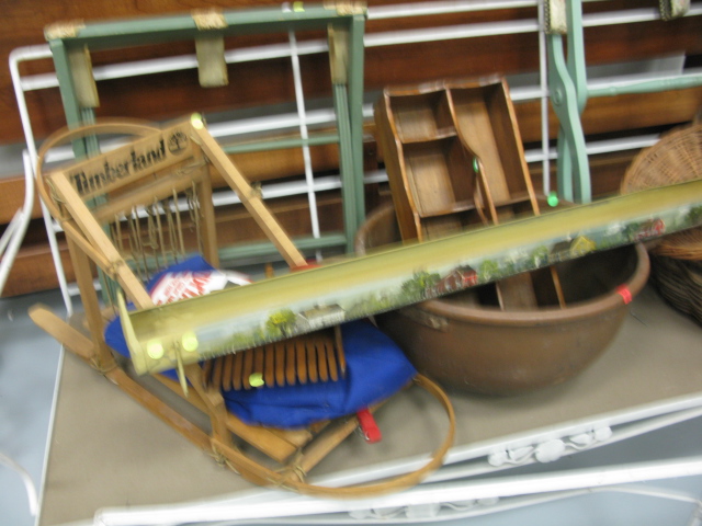 Group lot to include copper candy pot, sled, baskets, luggage rack etc