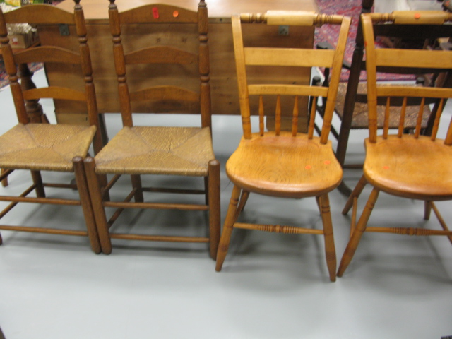 Four antique chairs, two with rush seats and two plank seats