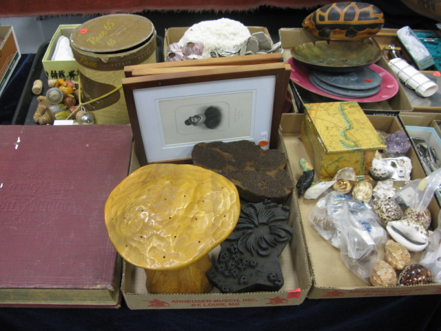 Ten box lots of miscellaneous items to include silver plated flatware, shells, wooden printing blocks, coral, large book etc