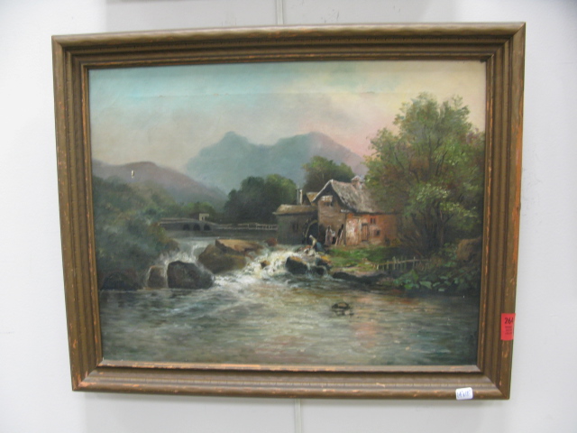 Five pieces, oil on canvas paintings, along with watercolor of boy fishing and two flower prints