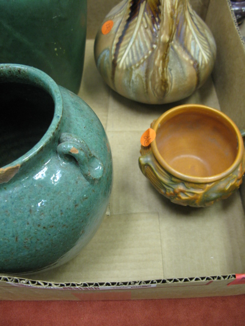 Box lot with four pieces of pottery and crystal lamp