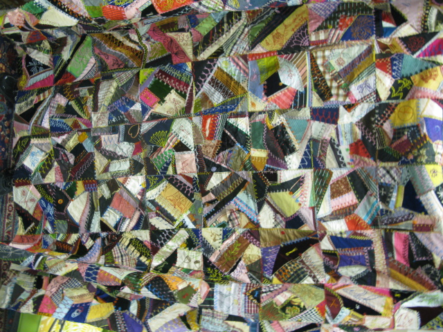 Lot to include early quilt, crazy quilt top and two pieces of blue and white homespun
