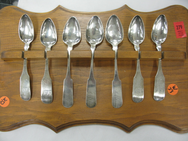 Group of fourteen coin silver spoons in holders