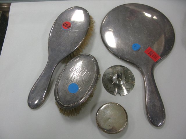 Group of sterling silver dresser pieces to include 5 brushes, mirror and two covers from the estate of Broadway actress Leta Gold