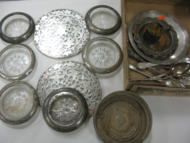 2 box lots to include 12 pieces of sterling, spoons and small plates, two silver overlay hot plates, silver plated coaster, wine coaster etc