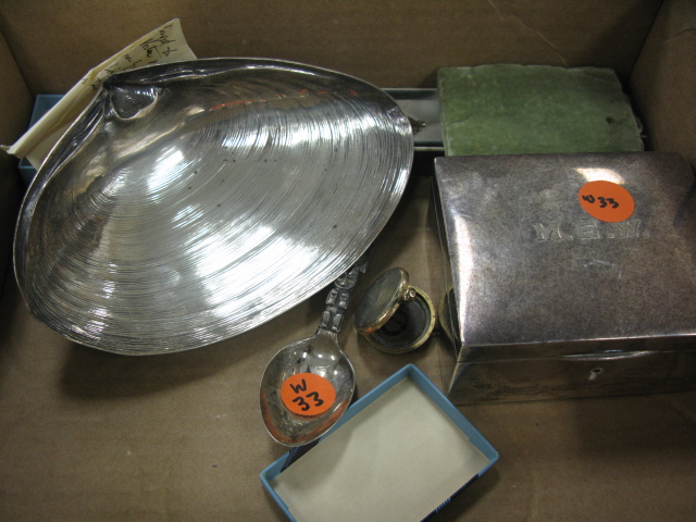 Box lot of silver to include clam shell, box and spoon