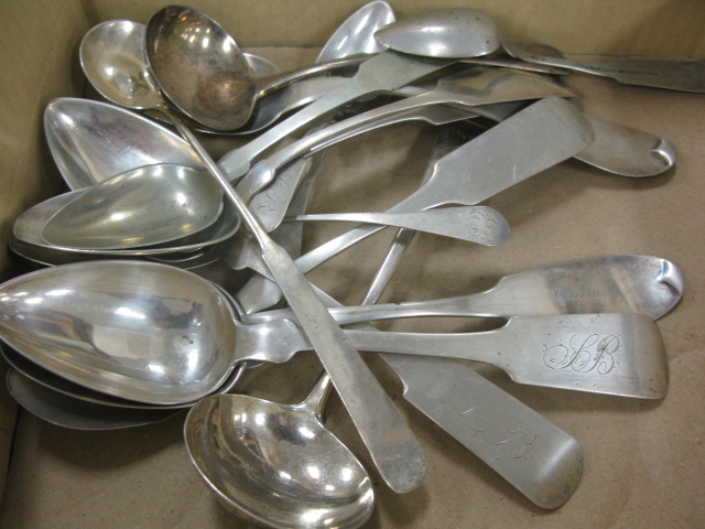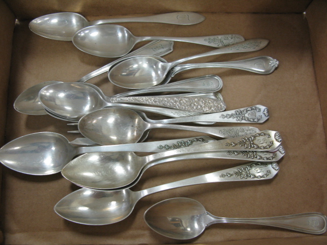 Box lot of coin silver spoons from the estate of Broadway actress Leta Gold