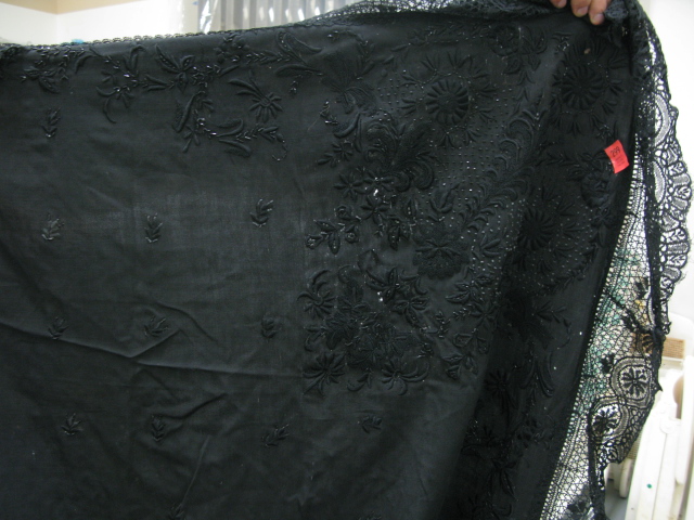 Two shawls, one black with beadwork and one white with embroidery